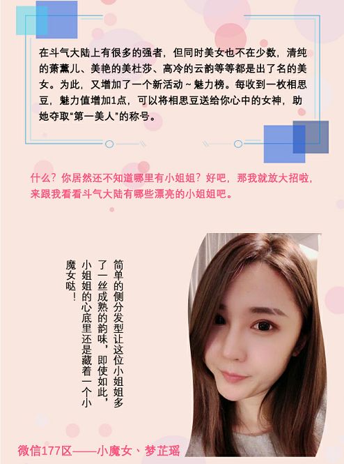 斗气大陆上有很多强者,同时也不缺乏美女,魅力榜的新活动使很多隐藏在大陆深处的美女也慢慢浮现在众人的眼前,我们一起看看斗气大陆上那些漂亮的小姐姐吧!有没有你喜欢的呢?