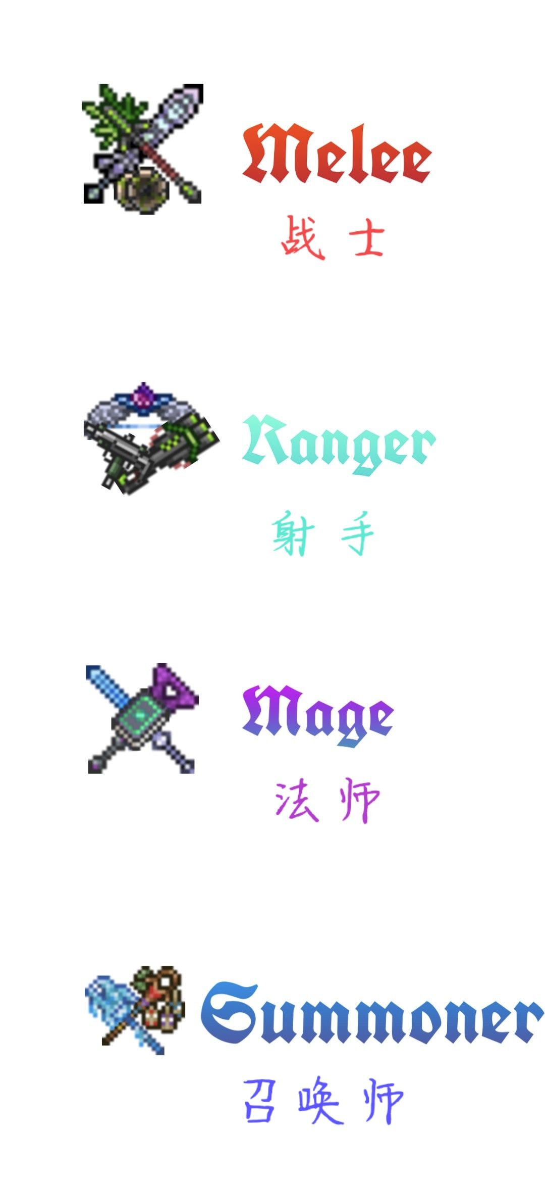 肉后摸鱼期——刚过肉山,砸完祭坛挖新三矿,在较长时间都没有与boss对抗的能力(当然钓鱼开宝匣可以快速度过这一时期)此时职业开始分化