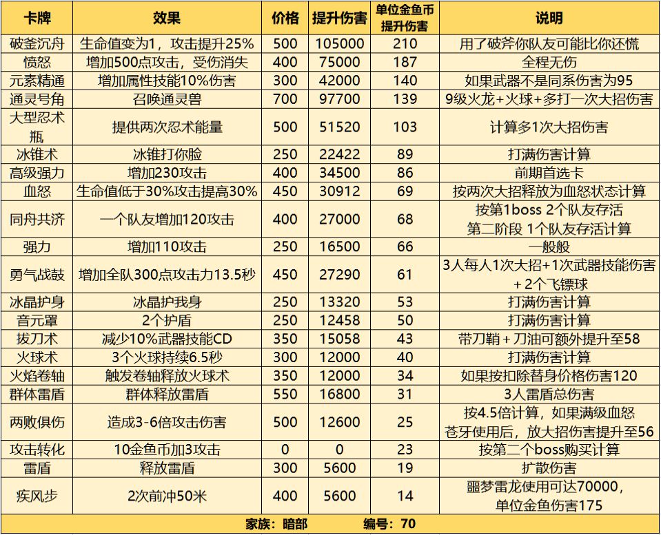 ★表中列出的卡牌伤害属于理想值,以破釜沉舟为例,伤害提升相应的击杀boss时间也就缩短,伤害会比理想值小,击杀boss时间和队友关系很大,所以无法准确算出时间变化,不过对排行影响不会很大