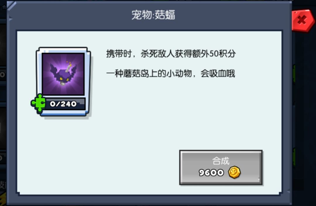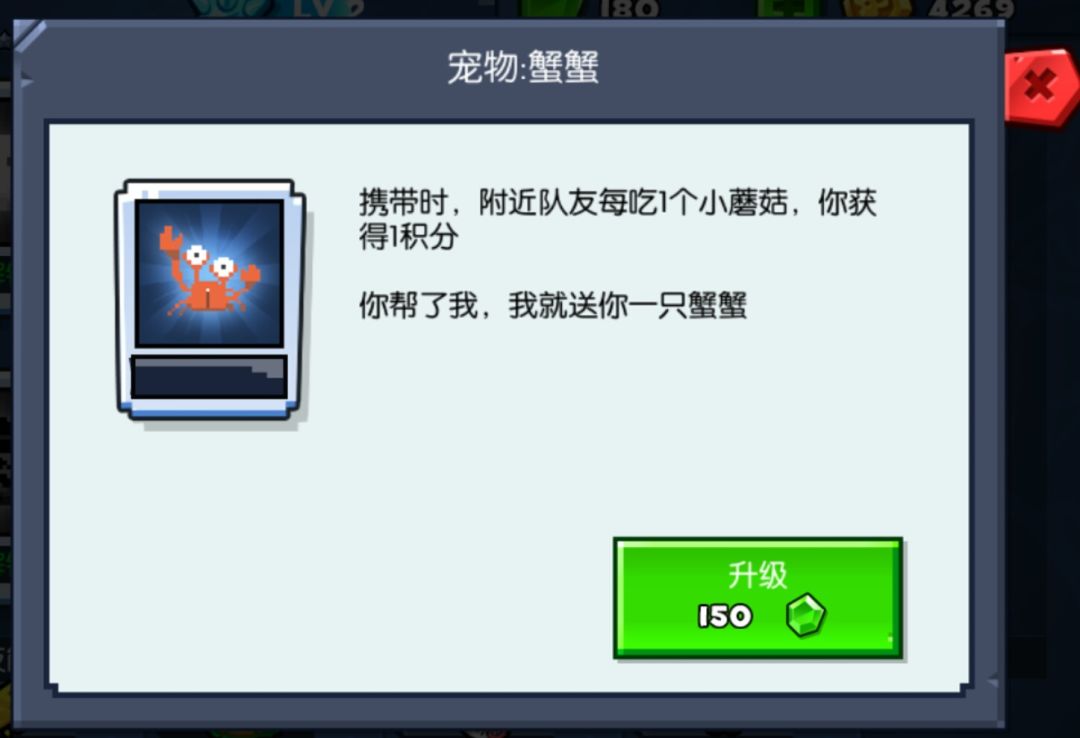 接下来就是宠物的选择,个人推荐携带菇蝠,其被动是每当你击杀一个敌人就额外获得50积分,效果杠杠的,当然,如果没有的话可以也可以考虑一下蟹蟹,作用是每当身边的队友踩一个蘑菇时获得一积分,相较起来效果并没有菇蝠刷分效果那么好,稍后我会为什么是选择蟹蟹而不是足球等其它效果差不多的宠物。