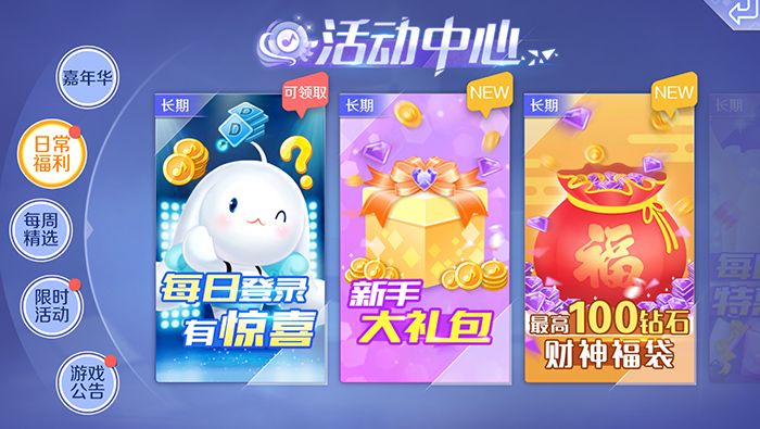 日常福利中依然有每日登陆活动,这个每日登陆活动是长期的,每日登陆即可领取到金币、点券等奖励。同时这里还有新手大礼包、财神福袋等充值活动,日常活动中所有活动都会长期开放,记得每天登陆游戏后到这里来领取每日登陆的福利!