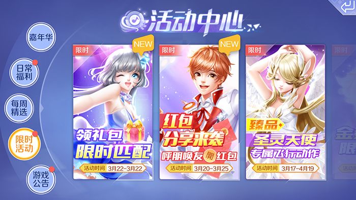除了每周精选活动之外,炫舞中同时开放了限时活动,这里的活动一般会有开始和截止日期。活动类型比较丰富,除了限时完成匹配对战之外,会提示很多限时的宝箱和其他短期活动,这些活动通常奖励会更丰富,所以非常推荐完成。