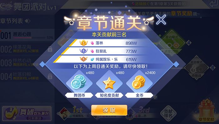 最后,舞团派对奖励的舞团币最多,但需要舞团内所有玩家,同心协力来完成歌曲的挑战。每天我们都有3次参与舞团派对歌曲挑战的机会,达成挑战可以推进派对章节进度,当章节进度达到100%时,所有舞团内的玩家都可以领取到大量的舞团币、知名度贡献、金币。