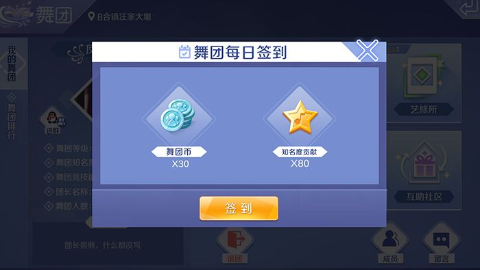 舞团每日签到是获得舞团币最简单的方式,只要登陆游戏进入舞团,点击签到即可获得30舞团币、以及80舞团知名度。贡献舞团知名度会影响舞团周宝箱奖励,所以舞团的人数越多、活跃度越高排名也会更加靠前。