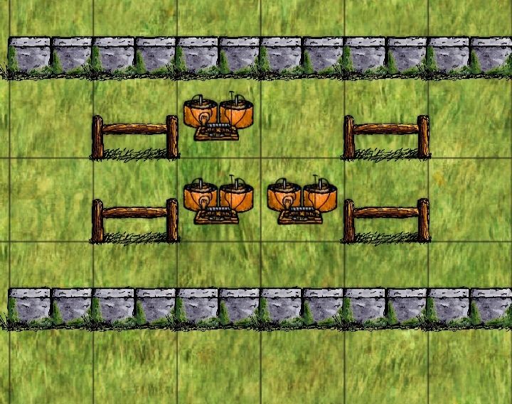 (上下两排钟塔底座构成的通道分别通往两个区,先假令左边是农业区B右边是铁器区A,以下的图皆同)