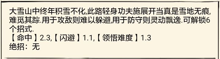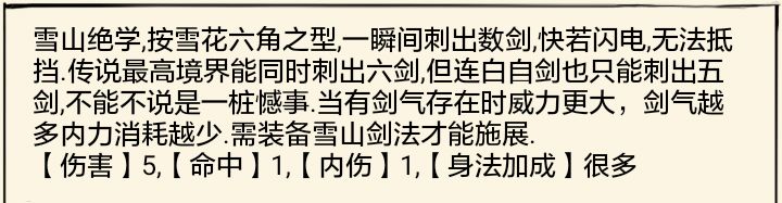 雪山剑法的属性中规中矩,命中只有一,但身法加点会给他带来命中和加成,使雪山剑法一定的潜