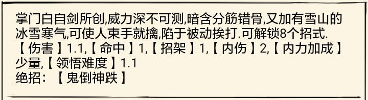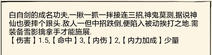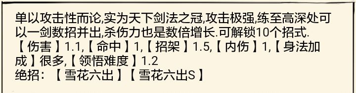 绝招:寒梅飞雪:剑法60,内功60(门派)用处主要是叠剑气,然后还有补充伤害