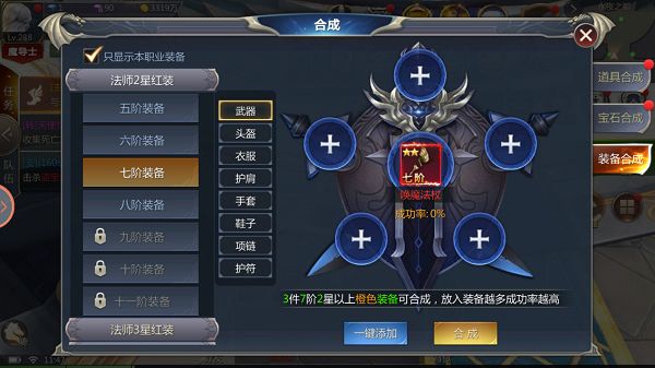在角色等级达到230级时,开启了装备合成功能,相当于打开了新世界的大门。由于装备有品质和星级区分,红色装备会比橙色装备战力高,二星装备又会比一星装备战力高,而相同阶数的装备,红色一星不如橙色二星战力来的高,同时橙色二星装备可以合成红色二星装备,红色二星装备又可以合成红色三星装备,所以,二星的橙装和红装,都是值得留着的高价值装备。而一星的装备,由于无法合成,只能当做过渡装备使用,一般不推荐长期穿戴。
