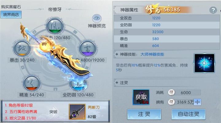 想要神器提升更高的神器效果和神器修为就需要进行不断的培养,我们可以选择全攻击、全防御、生命值、暴击和精准这五行属性进行提升,五行属性提升到顶部准备充足的地火之晶就可以进行神器突破了。神器提升需要用到黑曜石,我们可以在境界商店定星、摆摊、凌烟阁副本、家族商店以及灵玉商店中获得黑曜石,可以在凌烟阁副本以及家族拍卖中获得地火之晶。