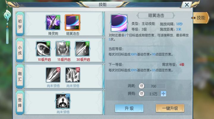 暗翼连击:对附近最多5个敌人造成物理伤害,可以连续释放,最多释放三次。