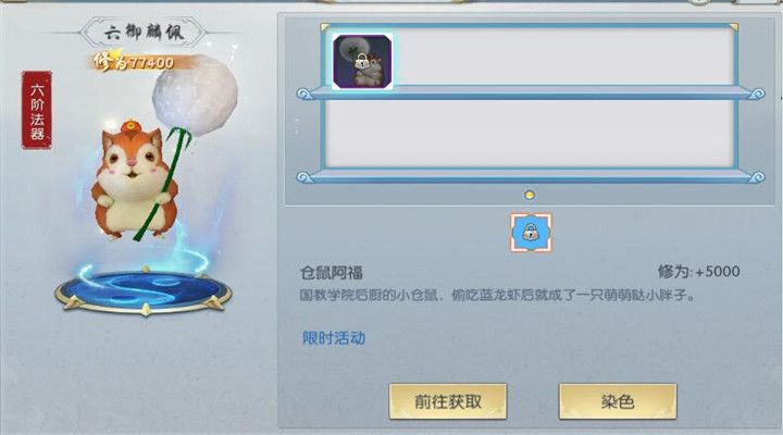 仓鼠阿福是一只非常可爱的小胖子,手里还拿着一朵巨大的蒲公英,这样才可以使自己的身体悬浮在空中。白色才蒲公英与圆乎乎的仓鼠非常搭,所以这个法器外形非常的惹人喜爱。目前仓鼠阿福只有一个获取途径,那就是在皇室宝藏中开启宝箱获得。我们可以将仓鼠阿福的奖励放入宝箱中,然后通过抽奖的方式来获得。