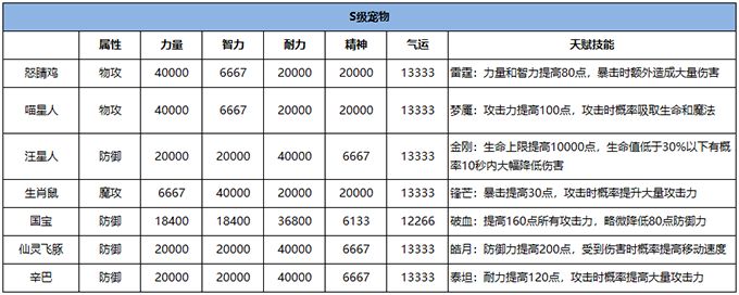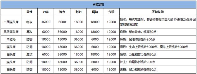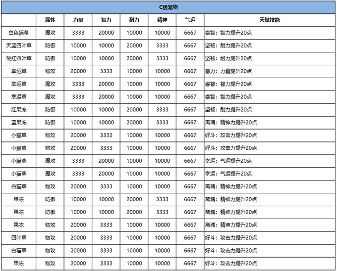 注:表格中部分宠物名称、属性、天赋技能相同,但外观颜色不同。