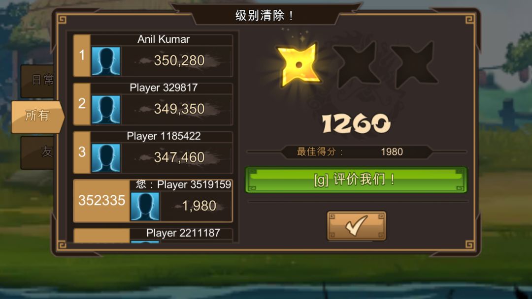身为一个强迫症,没有关关三星我是不会去玩下一关的,就是因为这样,第一关我打了五次都没三星,贼他妈气人,我明明全中,无miss,还才只有1980,还没有三星(╬◣д◢)好气
