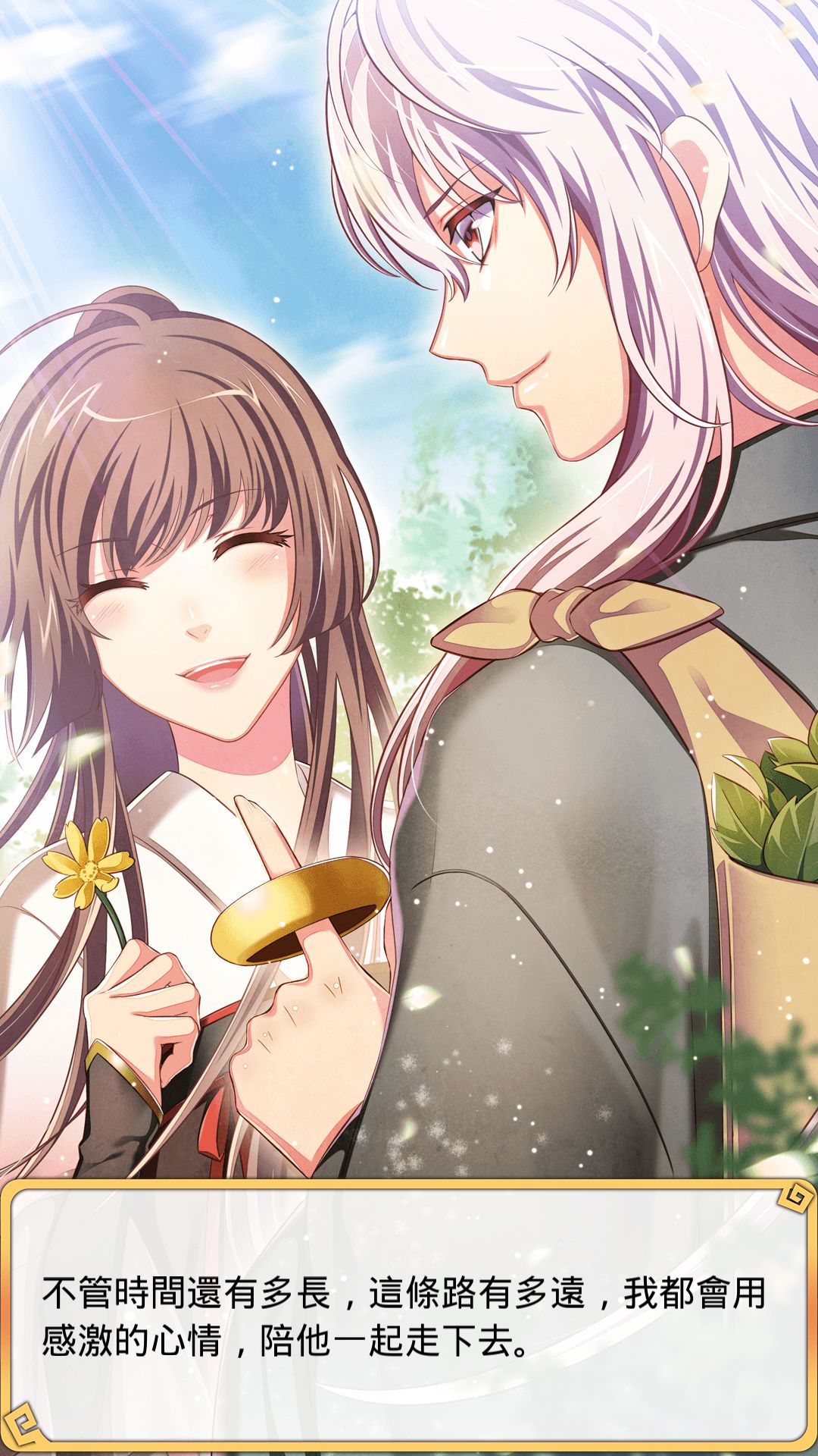 楚願泱開玩笑說這是不是殉情,女主說我只是不想讓你再離開我,你身體太弱了我得保護你。楚願泱說,好,如果有一天我會死,我希望能死在你身邊。(bad end 的flag)女主說她是不會讓他死的。楚願泱答應女主,能多活一天是一天,不會拋下她孤零零一個人。