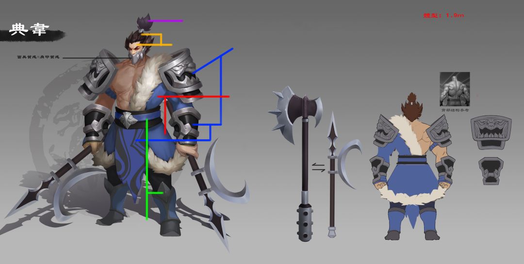 在造型时,我们特别设计了典韦凶神恶煞的表情来彰显“古之恶来”称号,另外还原他最强壮的身躯与肌肉线条。