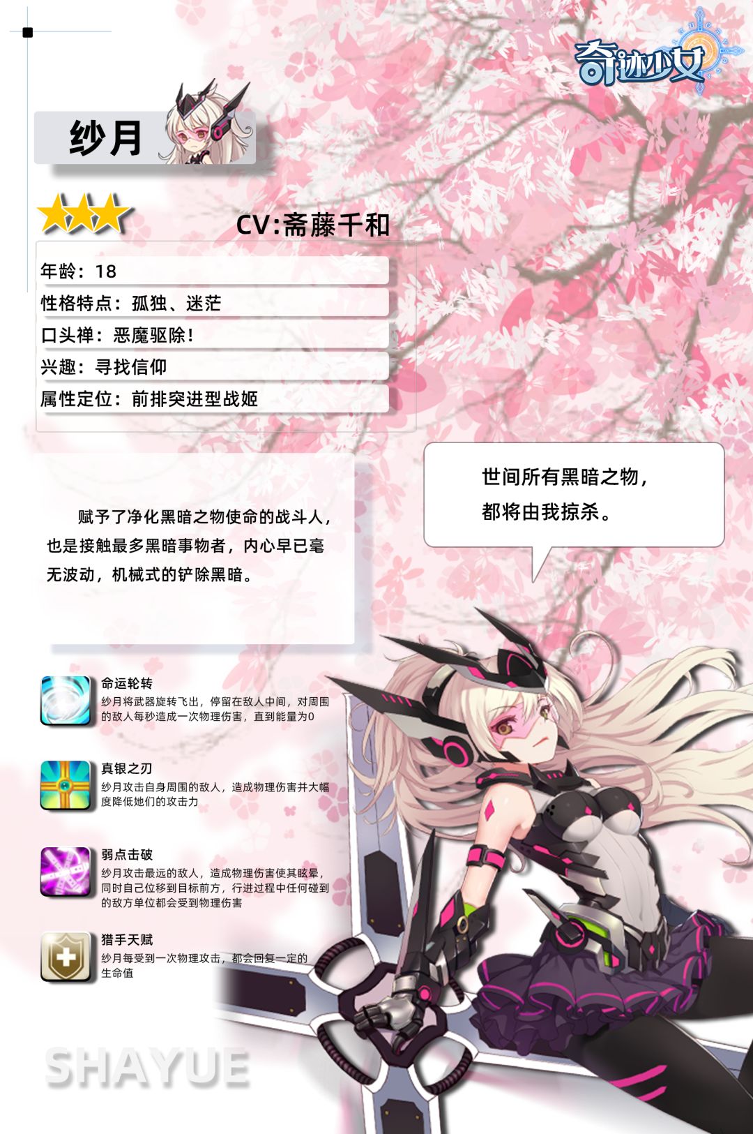 今天要为学长们介绍的是一位除恶驱魔的战斗人形,她是由斋藤千和配音的纱月学妹~