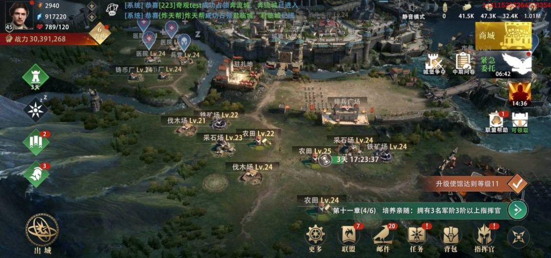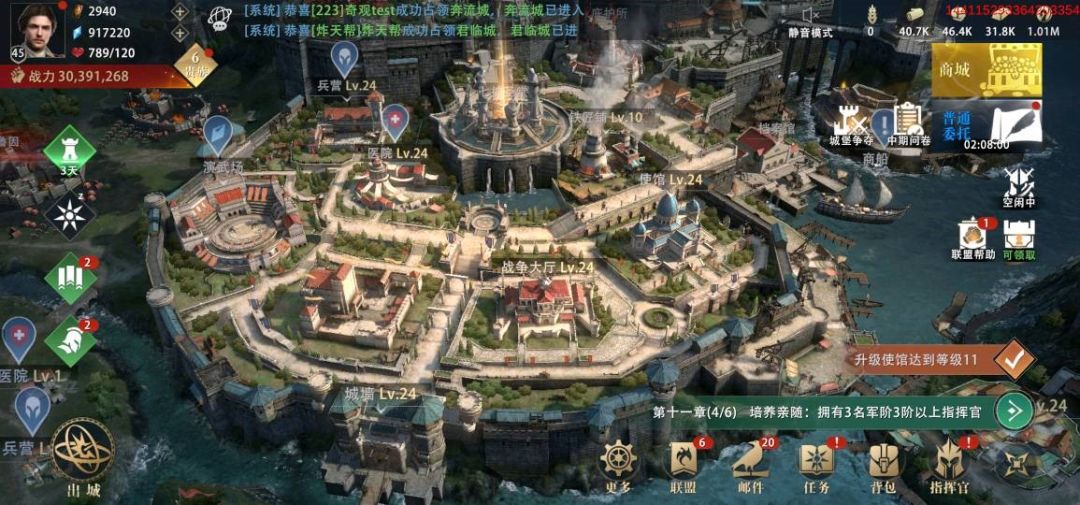 战争大厅升级后可大大提升集结军团的规模,使各位领主可集结更强大的盟友力量对抗更强大的敌人,尤其建筑满级后带来的集结全军攻击力10%加成效果,更可大幅提升集结军团战斗力。可通过野外采集、野外掠夺、建造资源田、参与任务活动等方式获取更多升级所需资源,通过钻石兑换等方式获取战典等,帮助建筑更快升级。