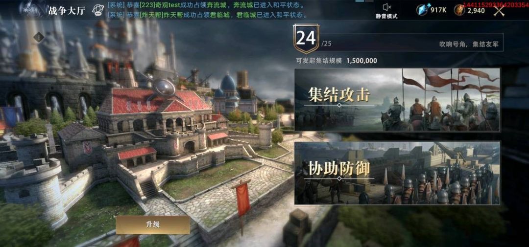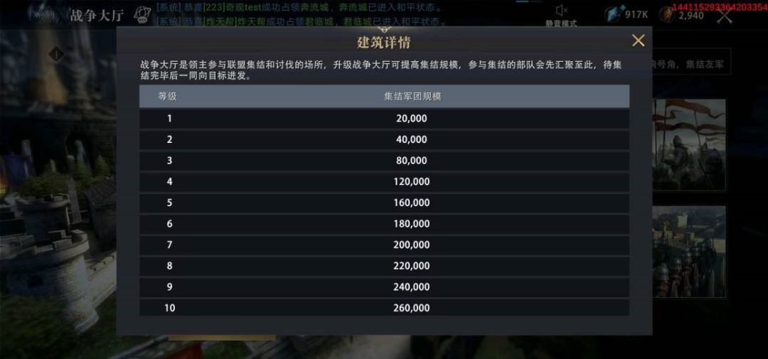 显然升级后建筑的集结军团规模有了很大的提升,可以使领主大人们在集结盟友战斗时汇聚更大的军队力量帮助我们对抗敌人,偏战争路线的领主不要错过此建筑的升级。参与盟友发起的集结与协助盟友防御时,可派遣军队的多少则与盟友战争大厅可集结军团规模有关。