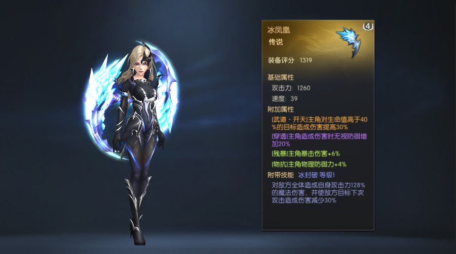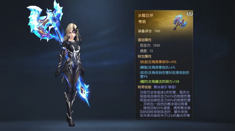 对敌方全体造成2次伤害,每次分别造成自身攻击力65%的物理伤害和造成自身攻击力88%的物理伤害,并附加寒冷烙印效果,降低目标20%速度,携带寒冷烙印的目标受到攻击时,额外受到攻击者自身攻击力25%的魔法伤害,烙印消失