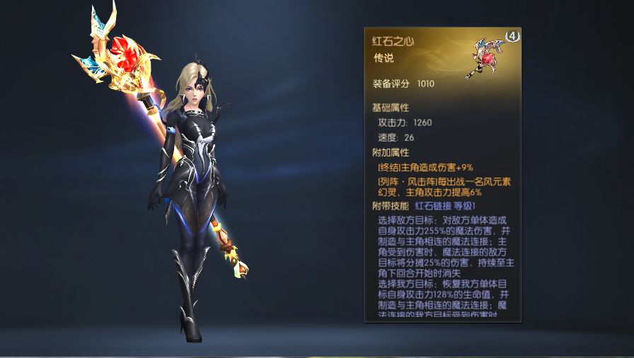 选择敌方目标:对敌方单体造成自身攻击力255%的魔法伤害,并制造与主角相连的魔法连接;主角受到伤害时,魔法连接的敌方目标将分摊25%的伤害,持续至主角下回合开始时消失