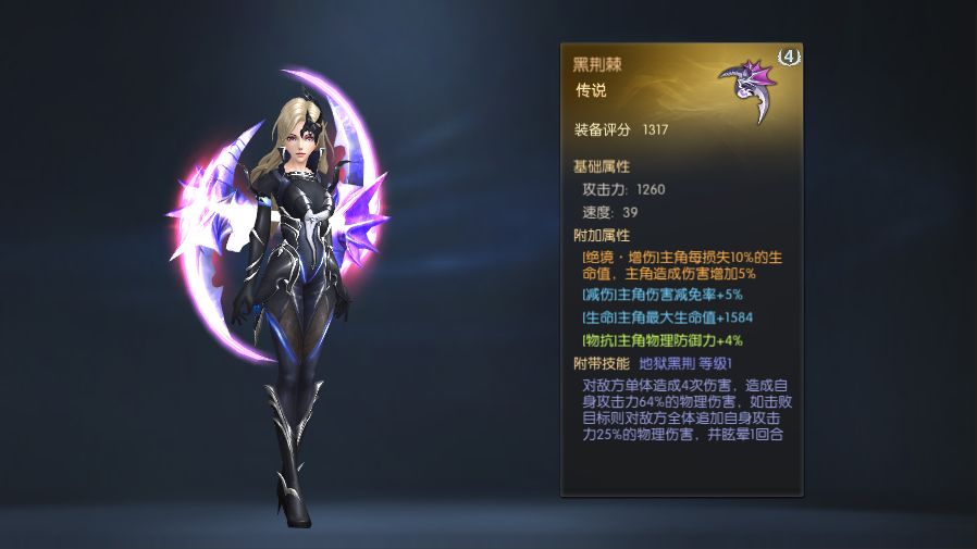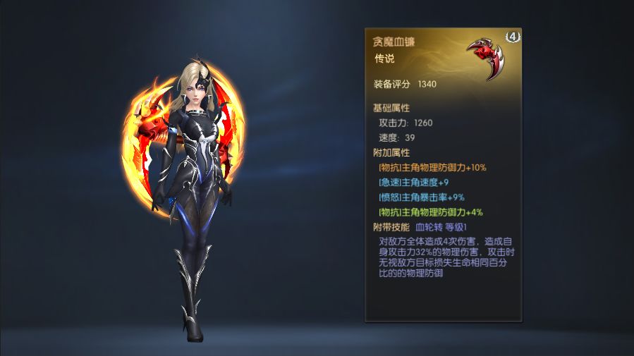 对敌方全体造成4次伤害,造成自身攻击力32%的物理伤害,攻击时无视敌方目标损失生命相同百分比的的物理防御