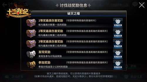 在规定的时间内没有捕捉到破灭之瞳的话,任务将宣告失败,讨伐战也将从目录中消除。讨伐战无论是发现还是助战,都有一定的次数限制。当然,讨伐战的奖励可是很丰厚的,不仅根据伤害值分成1等奖、2等奖、3等奖和参与奖,发现破灭之瞳的还有额外的发现奖励,每种奖励都能从中获得英雄碎片。