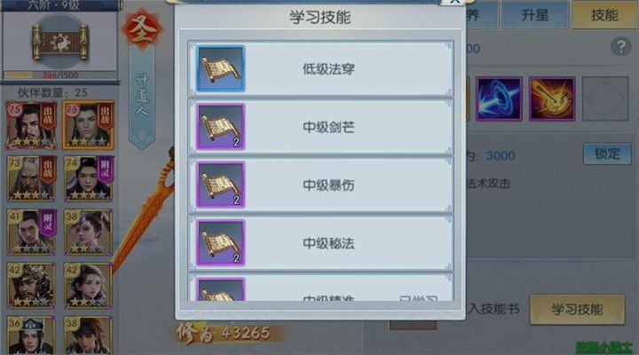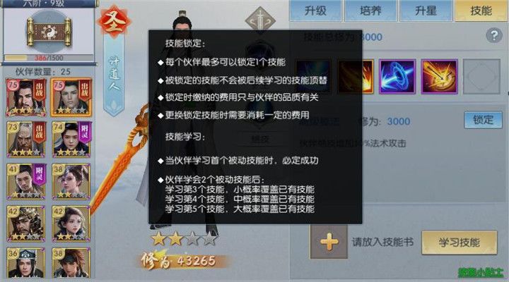 当低级技能学习好之后我们开始使用中级技能覆盖低级技能,当几个低级技能被中级技能书覆盖之后就可以学习一到两种高级技能了,第一次学习高级技能后可以用灵玉给技能上锁,然后再学习第二本高级技能,这样可以避免之前学习的高级技能被顶掉。经过一番操作之后,伙伴的技能就差不多学好啦!