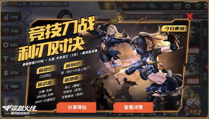 3月23日,《穿越火线》手游(以下简称:CF手游)上线新版本“刀王排位”。“传统模式”推出全新地图、英雄级角色、数把高品质武器以及刀王排位模式,更针对武器进行大规模的优化,力求带给玩家更刺激的开火体验。新版本从击杀、画面、声音、战斗细节四个环节着手,更新增战斗举报功能,力求打造公平公正的游戏环境。多项的细节优化,玩家从视觉、听觉上有更好的享受,让玩家战斗更痛快。