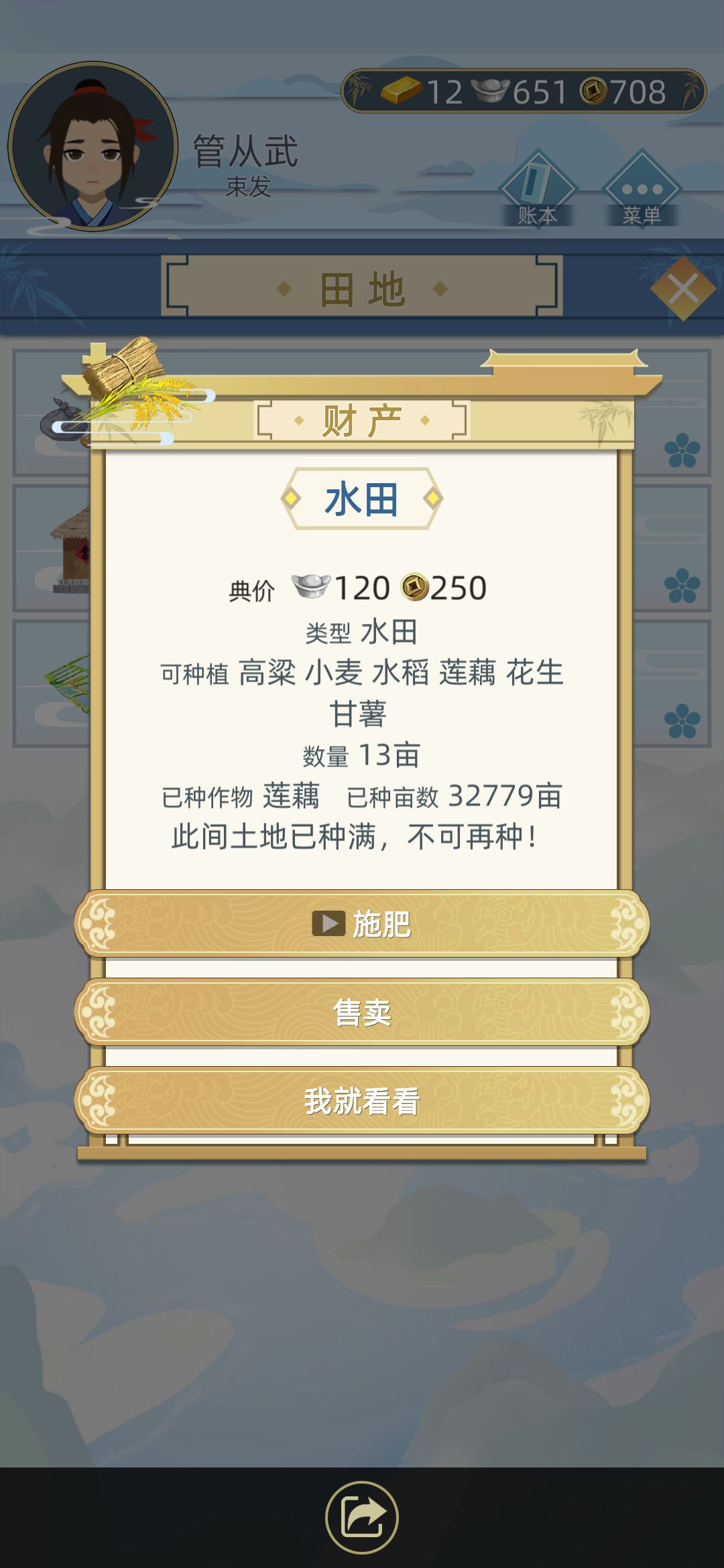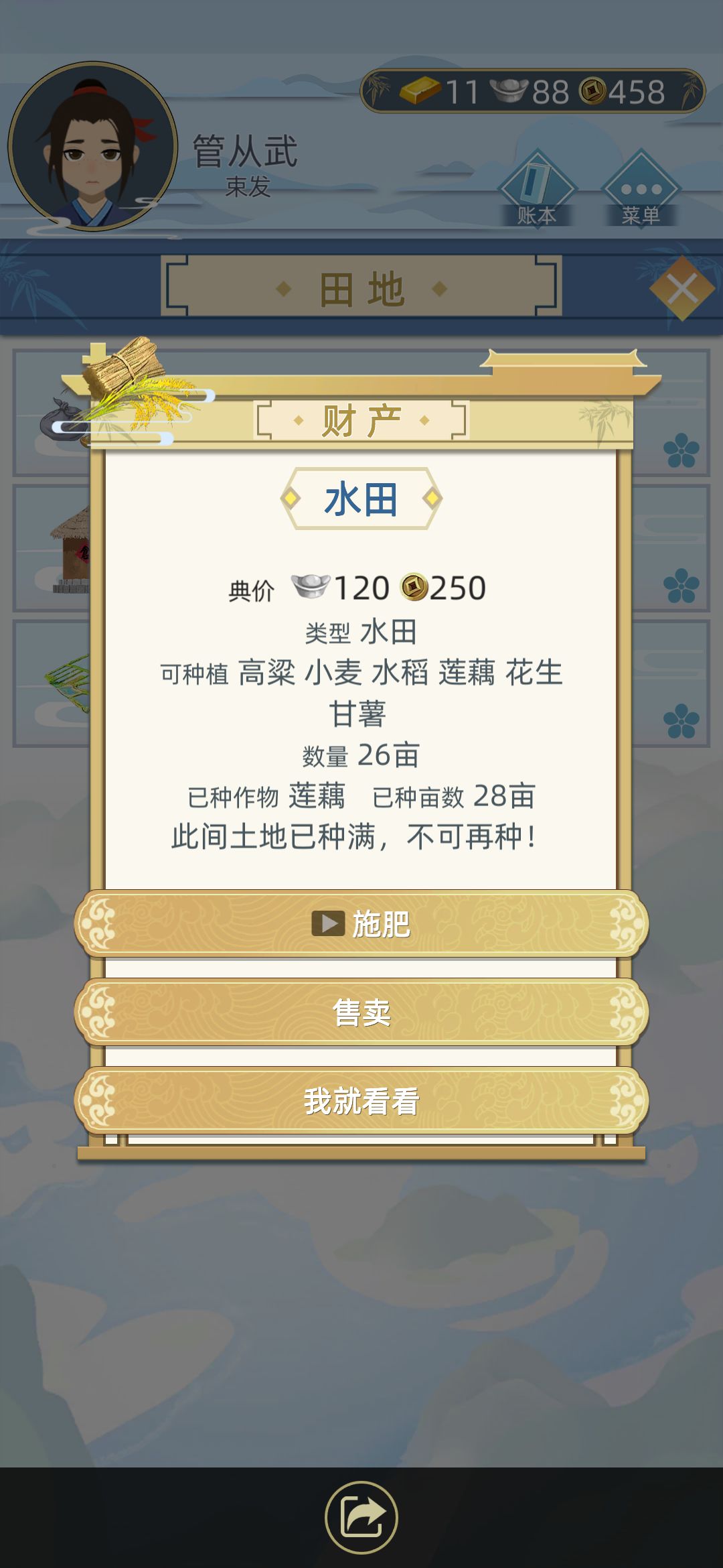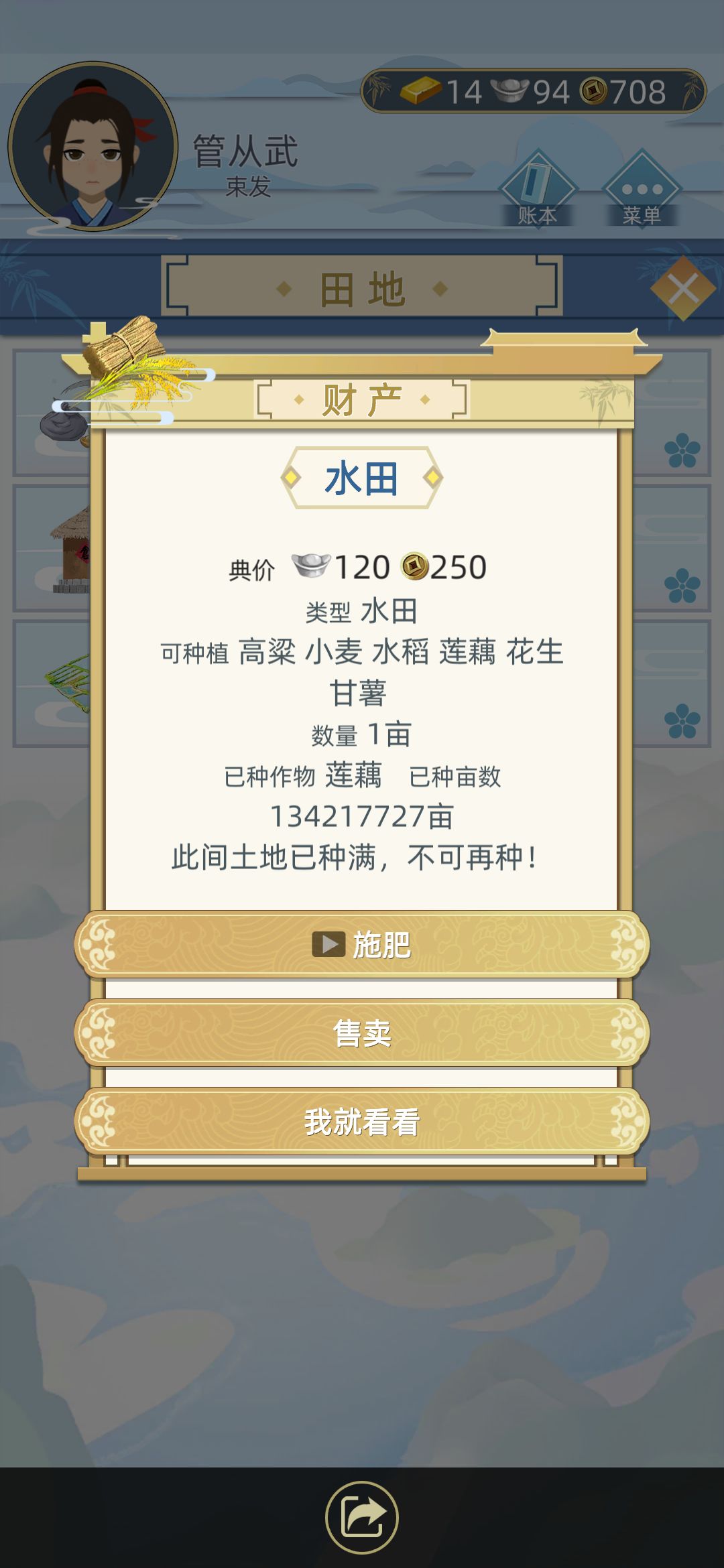 我实验了很多次 最多只能卖26次 再卖的话 已种植的亩数就会变成负数
