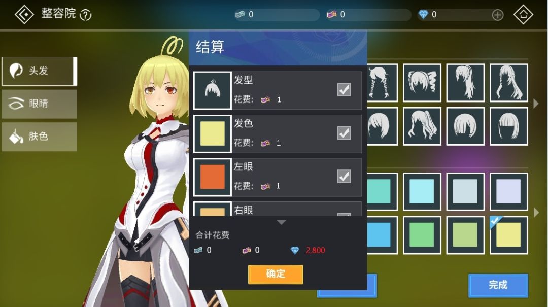点击完成按钮后,进入结算界面。会根据你选择的发型、发色或者瞳色等项目来进行结算。