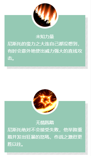 尼斯托作为一名强力的佣兵,其作战的能力与威力不容小觑。在前期,他的双刀可以对多个敌人造成巨大的伤害并造成眩晕等效果。到了后期,当他处于不利形势的时候,他的物理穿透能力可以得到提升,使他作战之激烈更胜以往。