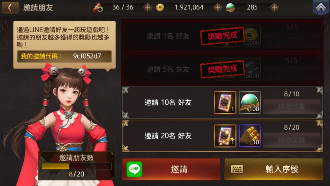 邀请码9cf052d7,进入游戏后,点击右上方有个line的绿色图标,然后填写邀请码领礼包吧。需要网络工具的小伙伴可以留下邮箱,大家互相帮忙。