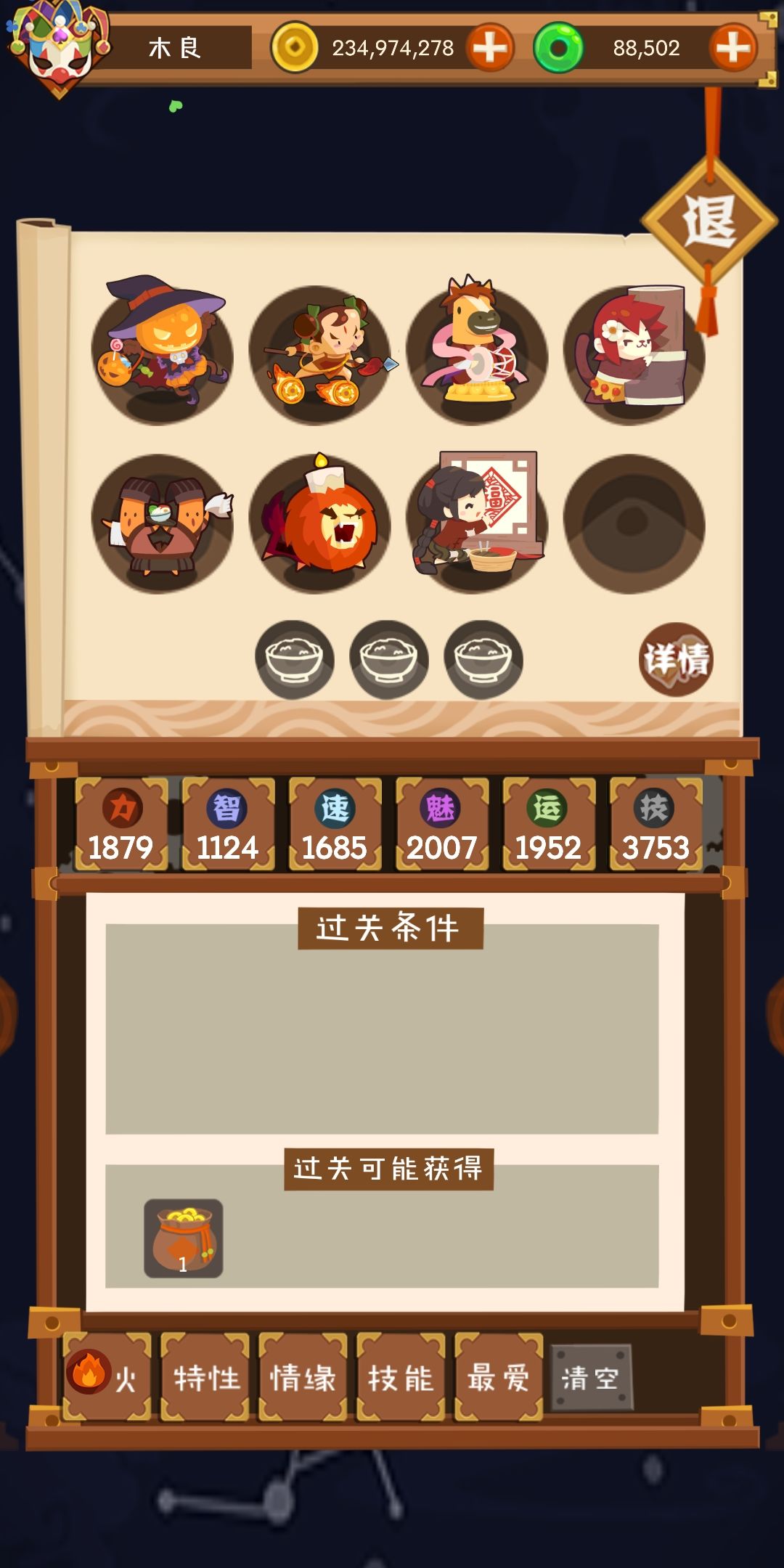 开启条件:通关第七章后解锁。材料掉落:皇家方块、皇家黑桃、皇家红心、皇家梅花。关卡条件:魅不低于4740。关卡配置:【木】三文鱼(青鱼)、飞燕姬(金银蕊)、圣诞树(松果)、国色大乔(荞籽)、萌萌小乔(荞似)、神笔马良(画精)、萌太骑(假虫)、鼓妖(音符)三文鱼是一只魅力百分比怪,圣诞树需要特殊材料升级。