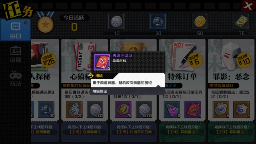 特殊:特殊订单只会在周末出现,玩家需要按图索骥,寻找出指定的NPC与之对话即可完成。只要完成一个特殊订单,玩家就可在每日任务中领取完成特殊订单的额外奖励并提高5点活跃度,奖励中包含精炼之尘和再造许可证。当然特殊订单原本的奖励也是可以领取的,这种一举两得的好事,相信玩家都不会错过。