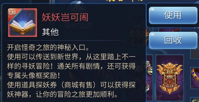 完成任务后,少侠将获得神秘道具“妖妖岂可闹”,点击使用即可进入玩法哦!
