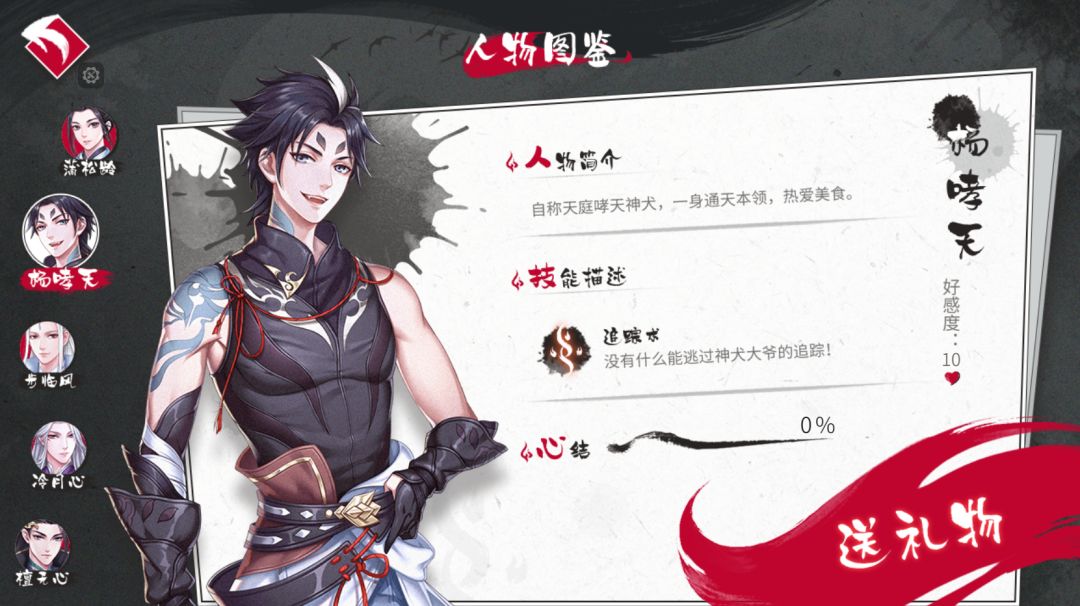 (3)感情培养——阿初寻妖冒险的路上,有五位男主陪伴左右,感情的维系也是必不可少的哦!各个角色的异能可以帮助你解决种种问题,比如蒲松龄的阴阳眼、檀无心的机关术……如果惹毛了谁,产生了隔阂,可就影响探案啦!