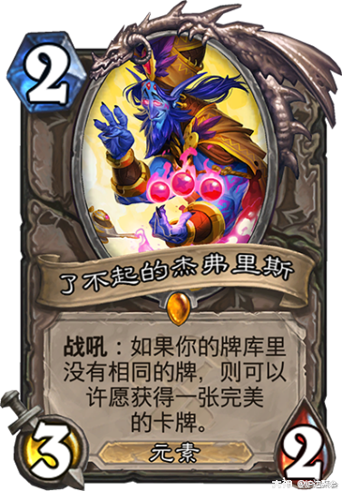 了不起的杰弗里斯,其实是;了不起的发牌员,了不起的神抽狗。谁说宇宙体系套牌只能存在于宇宙卡组中。鱼人骑卡组疯狂的过牌能力使得了不起的杰弗里斯可以让鱼人骑在牌库所剩不多的情况下,许愿完成斩杀。比如会根据对方英雄的血量,为你提供炎爆、火球、熔岩爆裂等直接斩杀手段。