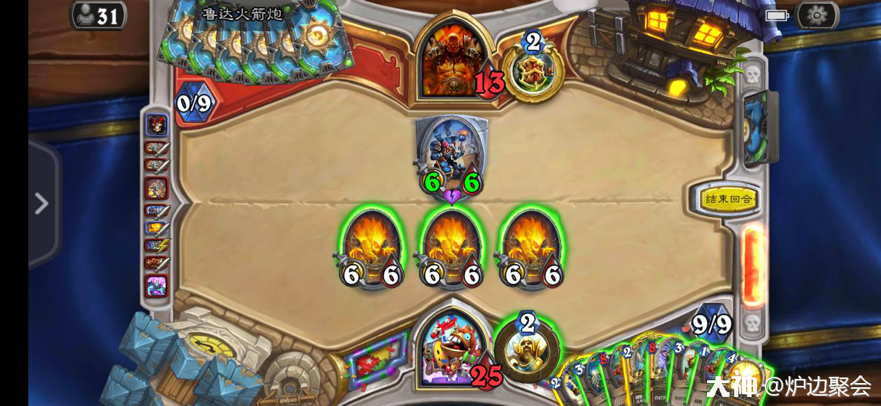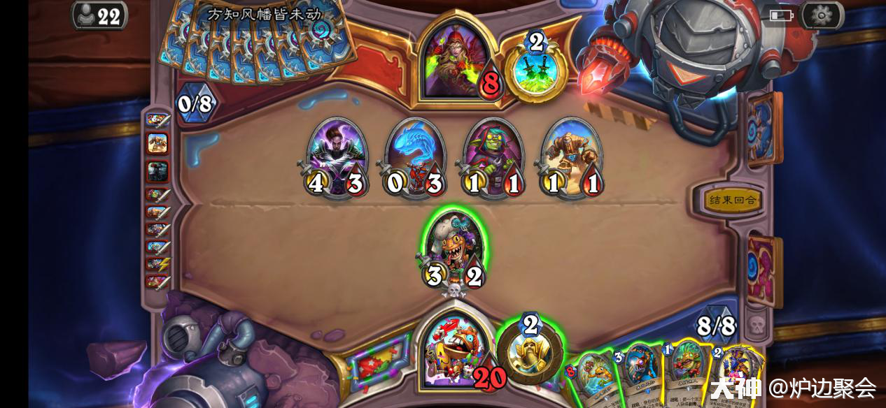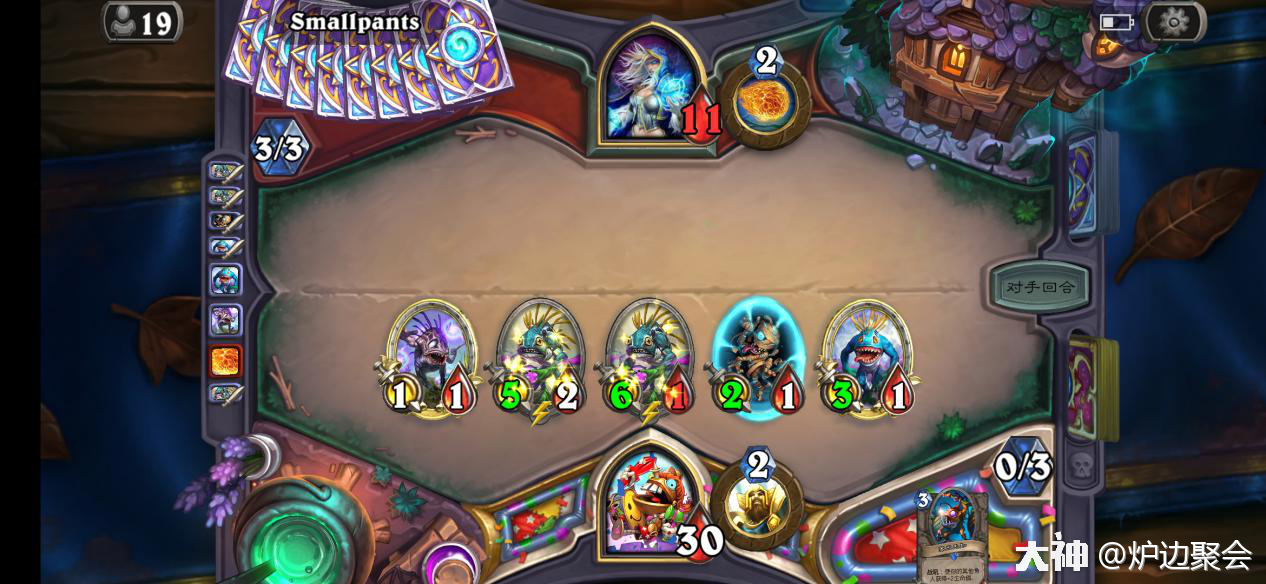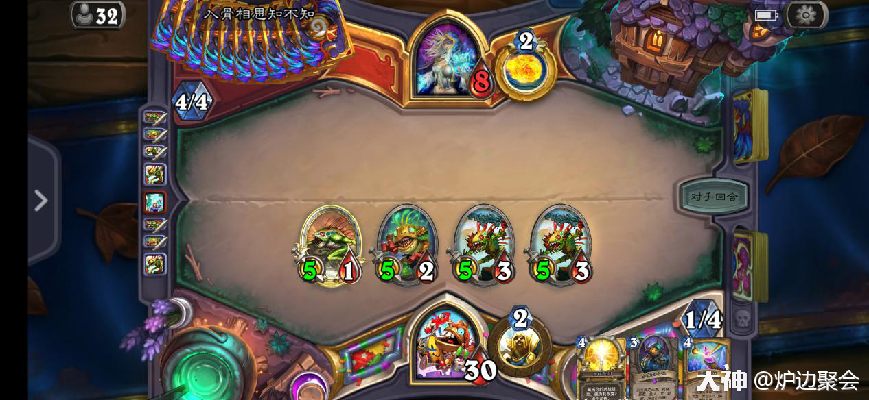 2.鱼人骑对阵战士时,很劣势很劣势的对局。要么靠着起手天胡用节奏压死对面,要么就只要靠连续铺场加上鱼人大军两拨打空牌库之后大厨赌对面没有乱斗。因此起手棱镜必留。