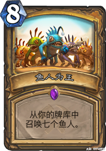 原先属于元气骑的强力过牌组件,如今配合奥丹姆版本圣骑士职业法术--鱼人为王,往往可以在前期(五六费左右打出一波强力铺场。)大大增强了鱼人骑的铺场能力和卡组强度,正如卡牌描述那样,鱼人为王这张法术使得鱼人骑在天梯牢牢占据一席之地。要注意鱼人为王不一定要空场打出,要清楚你打出鱼人为王的目的是为了当回合配合现有鱼人斩杀、还是召唤出冲锋鱼人增加输出、还是为了最大限度过滤牌库以配合大厨一波压死对面。