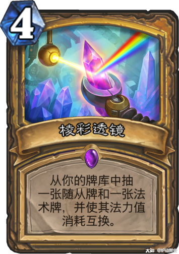 棱彩透镜是决定这套卡组是一般强还是强炸天的关键因素,后手三费硬币棱镜(前提是场面不会因为棱镜而丢失太多),四费鱼人为王,将是很多职业的噩梦。因此建议是后手要留棱彩透镜,先手根据对手的解场能力和你对对方卡组地判断综合决定。鱼人骑终究是铺场型快攻卡组,因此还是要节奏为先。起手没有棱镜也不需要刻意去找。