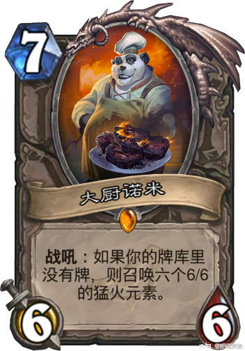 大厨诺米在上个版本就已经出现在刀贼的卡组构筑中,大厨诺米配合双暗影步最多三波的铺场曾是很多后期卡组的噩梦。上版本就已经有元气骑选择携带大厨诺米来打一个信息差,同时提高对阵战士的胜率。奥丹姆版本,大厨诺米在鱼人骑卡组中发挥着重要的作用。鱼人为王强力的过牌能力,配合大厨诺米一波至强铺场加上前期鱼人接连攻势消耗掉大部分解牌,往往可以劝退很多对手。