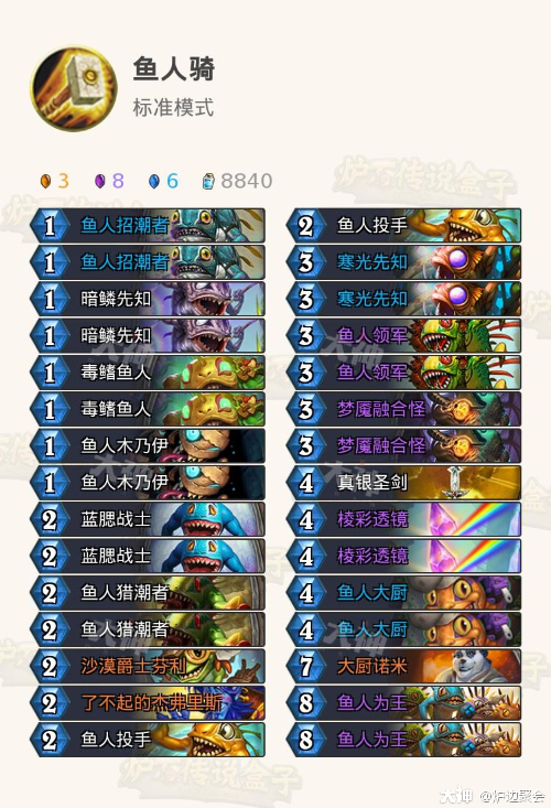 3.鱼人骑内战。凤年得来的经验是,前期节奏不丢,四费或者五费鱼人为王往往可以占据很大优势。因此棱镜无论先后手必留,其他根据之前的留牌原则灵活取舍。