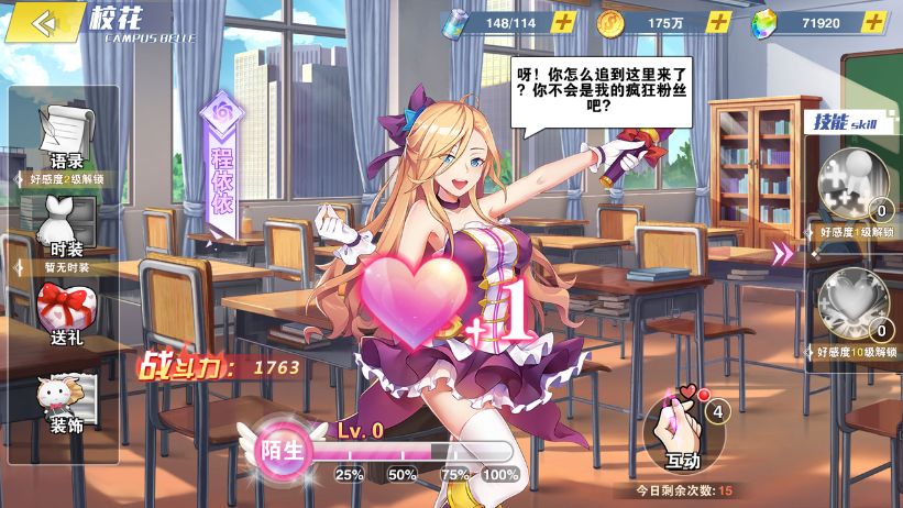 一开始,校花对我们都是陌生的,我们可以通过每天跟校花互动,送校花礼物,来提升校花的好感度。