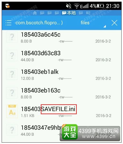 打开RE管理器(Root),按照以下路径 data/data/com.bscotch.floprocket/files点击,进入文件夹后,找到ini结尾的文件,打开它: