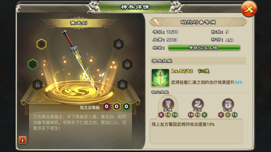 我们可以看出,昭烈刘备的新专属神兵黄龙剑不仅能为场上其他武将提供不俗的续航能力,激活铭文技能后,也能为场上友方蜀国武将提升一定伤害!