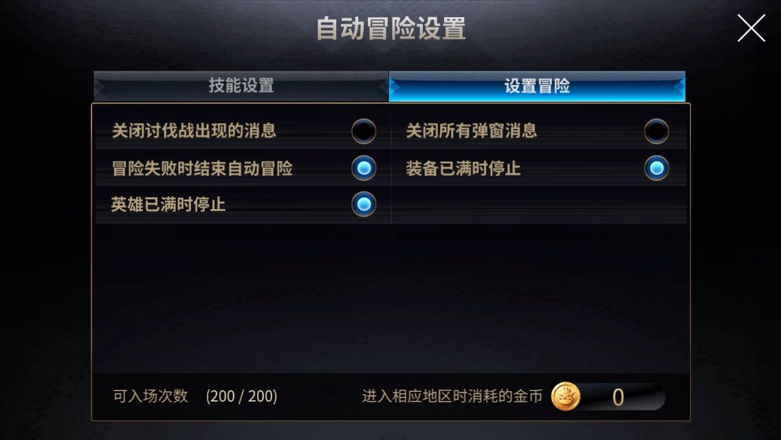 在【设置冒险】中,可以设置关闭信息提示和自动停止条件。