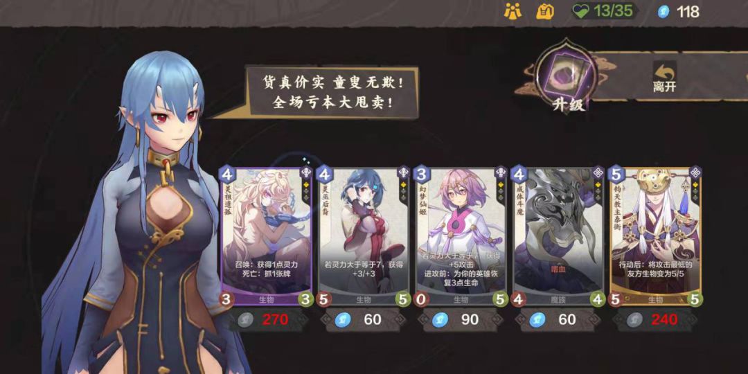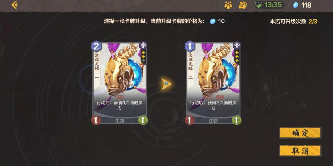 通过迷域中的各种遭遇可以获得特殊的货币“古币”,在迷域中遇到商人时,古币可以用来购买和升级卡牌。当然升级1/10/10身材的怪物是比较夸张哒,不过还是可以养成一张强力卡牌哟!