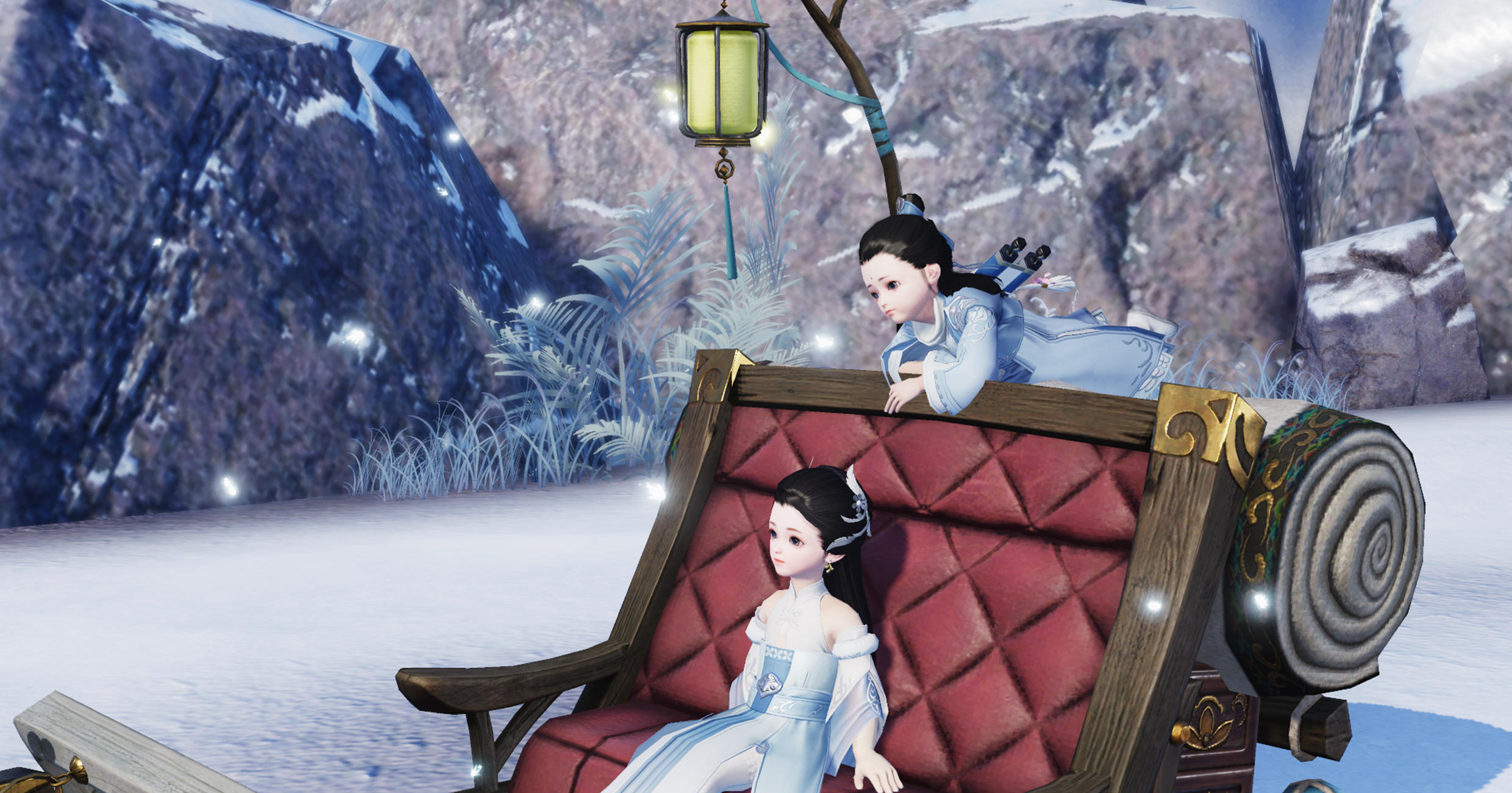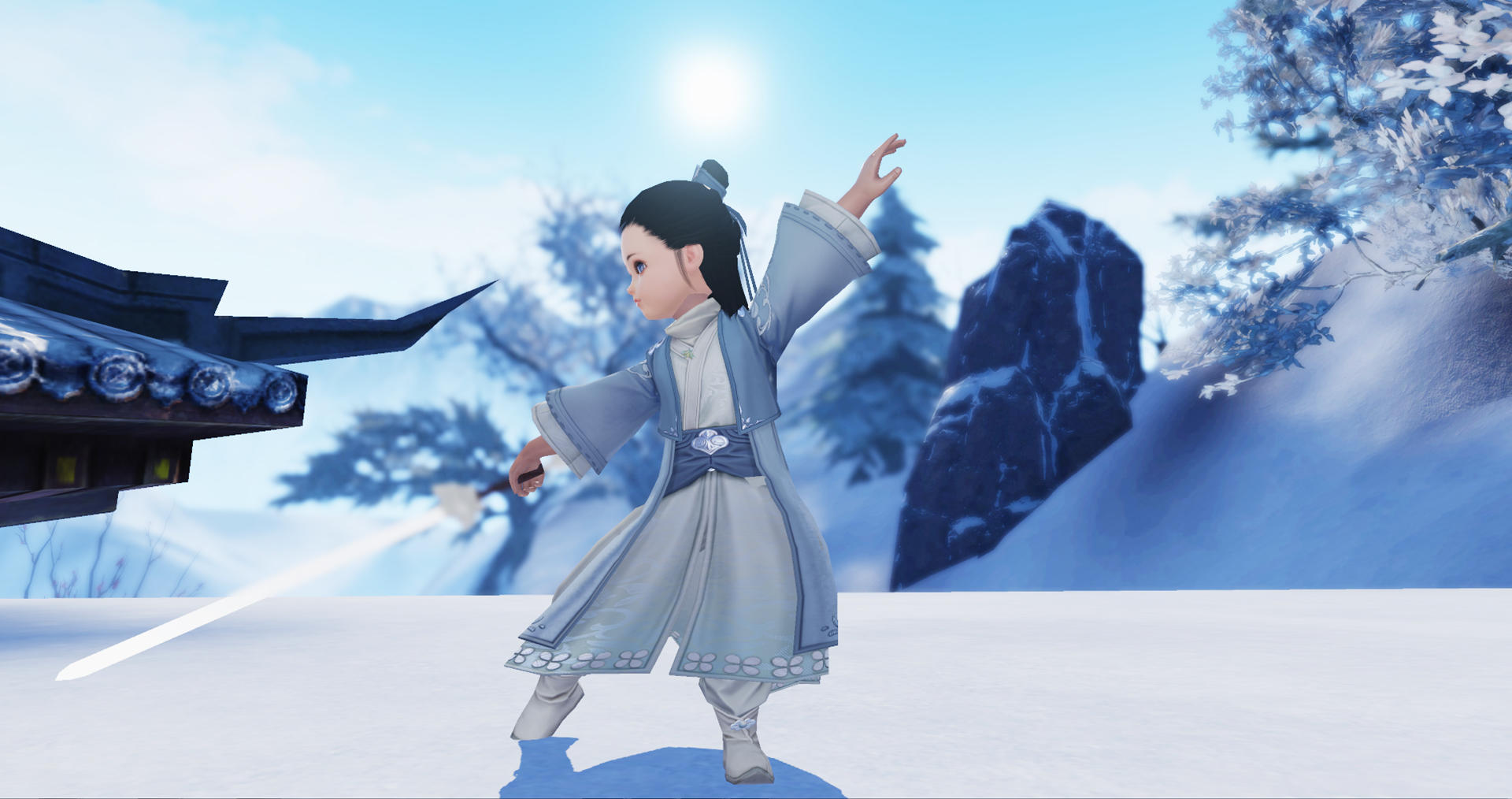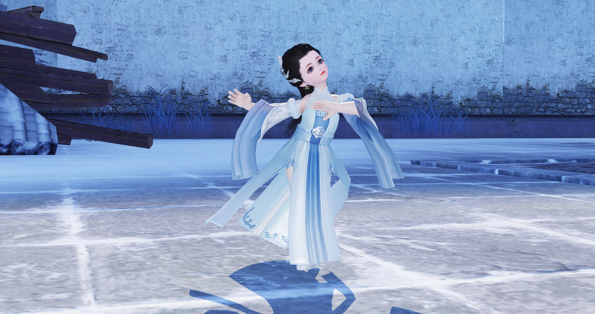 小女侠穿上君子兰,白色花瓣头饰镶于发髻上,绣着精致暗纹的渐变淡蓝色裙摆随风轻扬,显得天真烂漫又娴静可人。