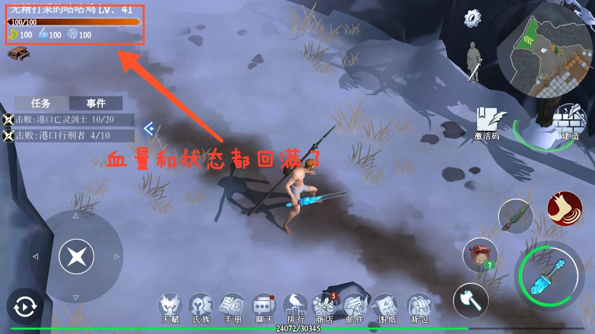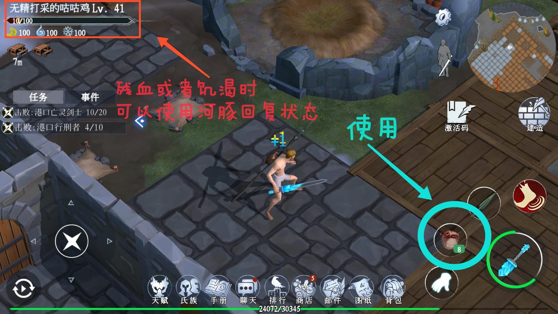 注意左上角的血量跟饥渴,如果这时候你不想吃药就来一条河豚