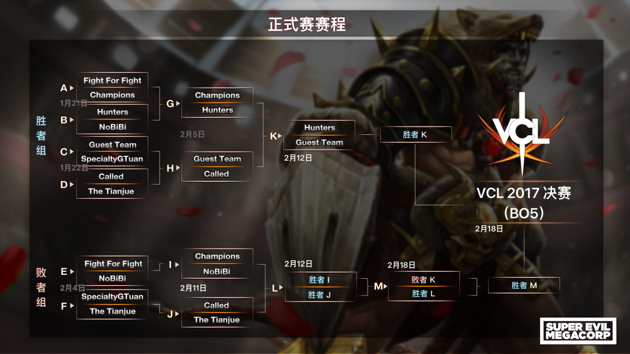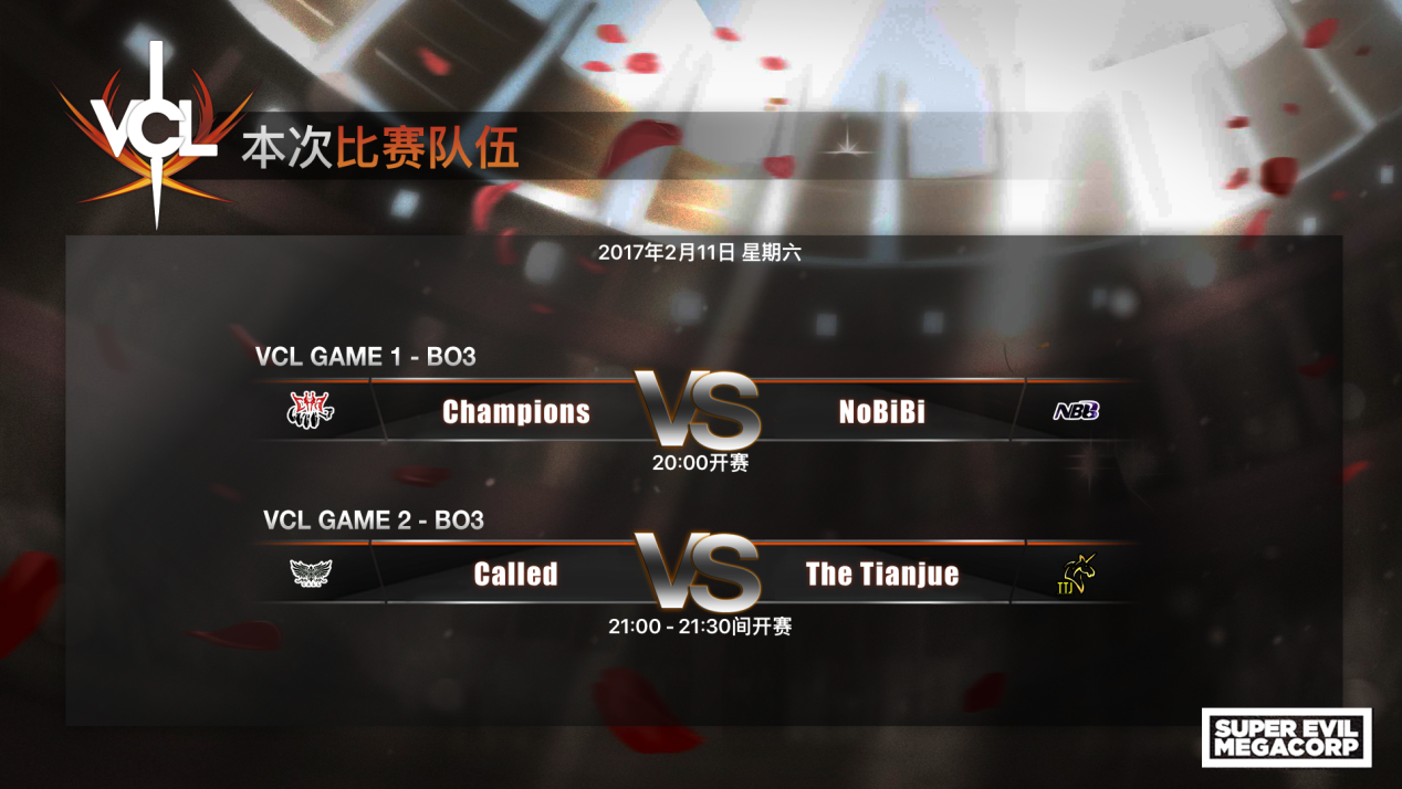 本届VCL八强赛采用双败淘汰制,即任何战队只要负两场比赛,即遭淘汰。而在明晚2月11日晚20点,Champions VS NoBiBi,Called VS The Tianjue,将展开败者组的再次对决,其中NoBiBi战队以及The Tianjue战队能否延续上一周的胜纪,从败者组中逆袭复活?且让我们拭目以待。